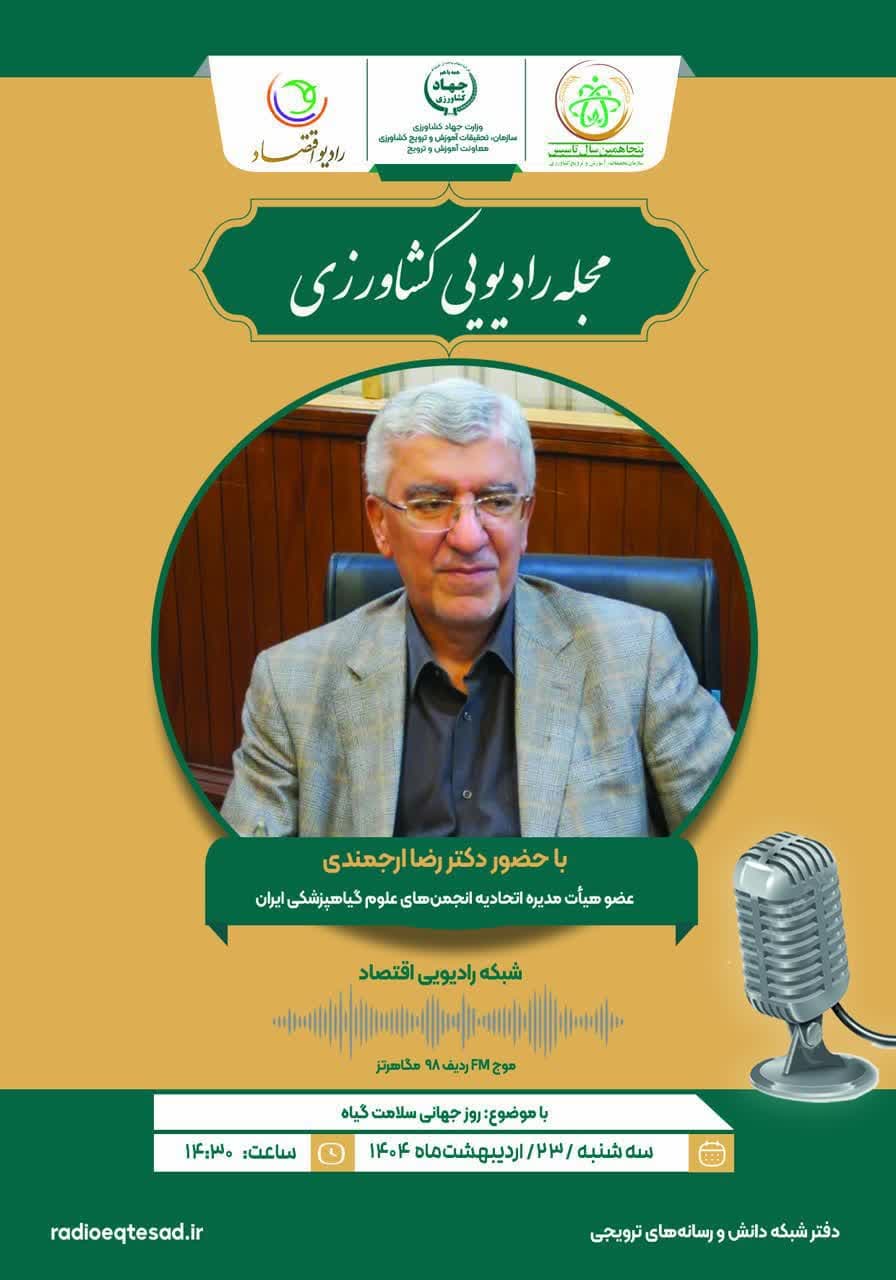 لینک برنامه زنده رادیو اقتصاد در خصوص روز جهانی سلامت گیاه، 12 می، 23 اردیبهشت 1404 ساعت 14:30، قابل دانلود مصاحبه خانم نوازی و مهندس ناصر نوروزی از مجله رادیوئی کشاورزی با دکتر ارجمندی، عضو اتحادیه انجمن های علوم گیاهپزشکی ایران
